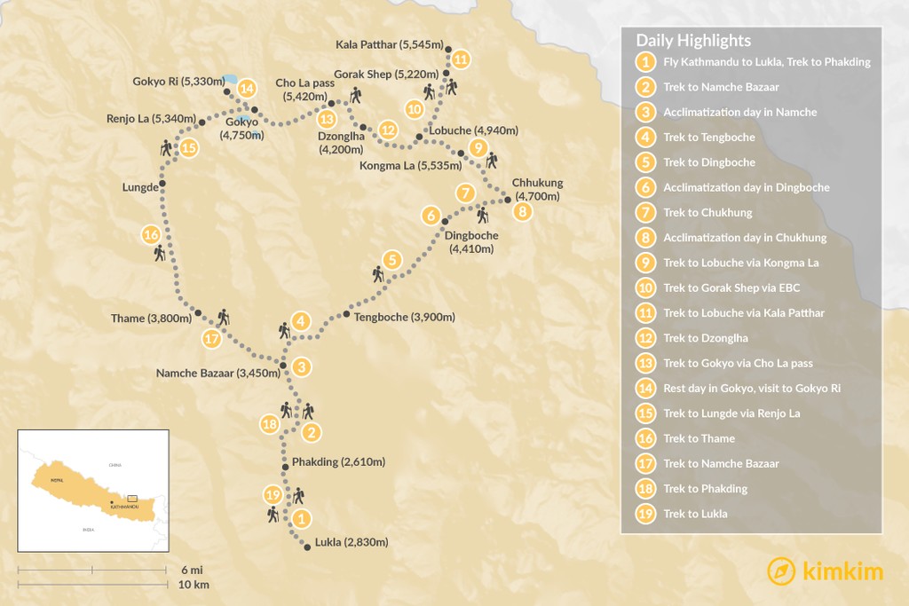 Notable highlights include a close-up view of Everest from Kalapather (5550m), a visit to Everest Base Camp (5364m) with its Khumbu icefall, and a challenging crossing of Chola-La pass (5368m) leading to the enchanting Gokyo Valley. Gokyo Ri (5330m/17487 feet) stands as one of the best viewpoints in the entire Everest Region, while Renjo La pass provides a panoramic memory of the Himalayan range.